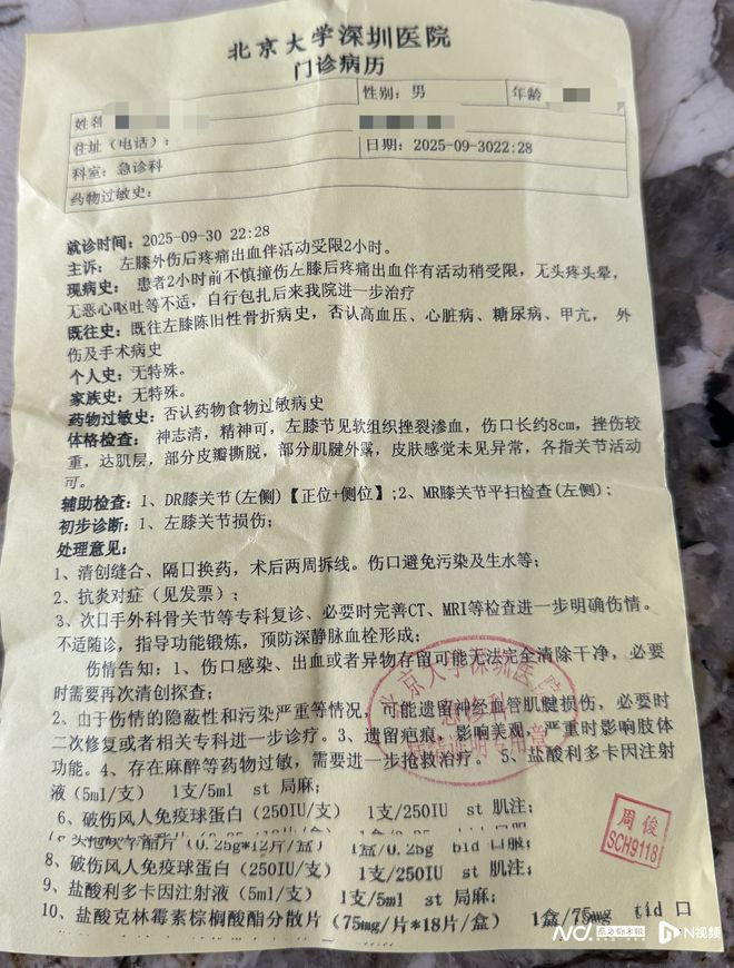 随后他被送往深圳北大医院,诊断结果为“挫伤较重达肌层,部分皮瓣撕脱、肌腱外露,左膝关节损失”,伤口缝合 12 针,需半个月后拆线。