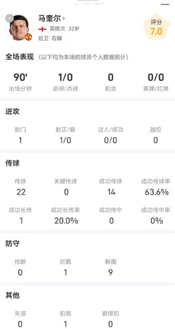 这场比赛里,马奎尔在全场仅有1次打门,而正是这一次攻门,帮助红魔打进制胜球。马奎尔在场上有着22次传球,其中14次成功,传球成功率为63.6%。马奎尔还有着1次成功长传,长传成功率为20%。作为球队的后卫,马奎尔在进攻端闪耀的同时,没有忘记自己的本职工作。马奎尔在场上有着1次拦截和9次解围,多次化解对手的进攻,这同样显得非常难能可贵。
