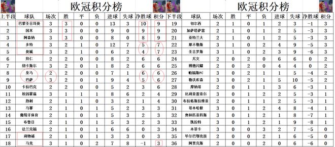 积分榜方面,巴黎,国米和阿森纳继续保持全胜,而且今天三队还都是“狂刷”净胜球,巴黎刷了5个净胜球,他们就凭借1个净胜球优势继续力压国米领跑,阿森纳差国米1个净胜球排在第3。巴萨狂胜止住颓势后,差皇马1个净胜球排在第9,多特,曼城2胜1平保持不败,排在第4,第5。