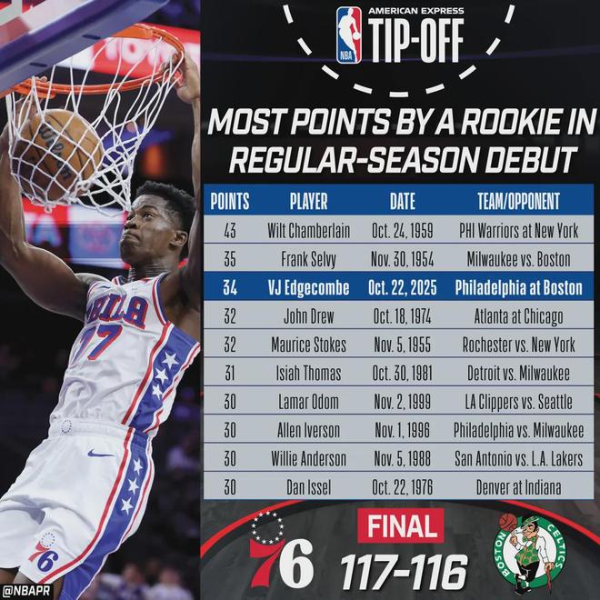 NBA新赛季,各队揭幕战至今,已有四名球员打出单场得分40+的表现,美媒OptaSTATS对此表示,这是NBA史上首次出现,具体如下:马刺125-92狂胜独行侠,“第一高僧”文班亚马用不到30分钟投篮21中15,狂轰40分15板3帽,一己之力爆掉了对面浓眉哥(22分13板)为首的豪华内线群,新科状元弗拉格此役出任首发控卫得到10分10板两双但0助攻。看来明夏的少林寺,将有大批的NBA球员前来进修。费城117-116险胜凯尔特人,马克西41分钟里砍下40分6助,新科探花秀埃奇库姆42分钟里砸出34分7板3助尽显天赋;对面的杰伦布朗,首次单核带队的他,25分6板4助进账。对了,本场比赛恩比德迎来了复出,但状态差到离谱一度被弃用,出战20分钟,投篮9中1,仅仅拿下4分6板2助,正负值-16全场最低,实在不行趁着他还有一丝交易价值时费城赶紧将其送走,避免彻底砸在手里,这哥们正在执行的合同29年夏天到期,近四个赛季薪资合计约2.4亿美元。湖人109-119勇士,东契奇状态爆棚可惜难救主,出手27次中17球,有着43分12板9助超级准三双进账,本赛季的他已经正式接过紫金军团的大旗。森林狼118-114击败开拓者,爱德华兹越来越有乔丹相,据悉他今年整个夏天都在苦练唯一闲暇时间是开启了中国行,然后成效非常不错,新赛季首战便以50%投篮命中率爆砍41分7板,就是才1次助攻说明其在盘活球队方面仍有提升空间。这场比赛,也是我们中国球员杨瀚森的NBA常规赛首秀,篮下单打四届DPOY戈贝尔勾手被大帽,勇敢补防被麦克丹尼尔斯无情隔扣......总之,欢迎来到NBA,常规赛可比季前赛和夏季联赛都要难打。杨瀚森首秀就打了5分多钟,投篮1中0,罚球2中2,得到2分1板。杨瀚森在场上打得火热,他的女友场下也没闲着,最近在网上硬刚黑子,更有甚者竟然极其无耻开黄腔。关注球员关注球场的表现即可,人家的私生活跟吃瓜群众没有半毛钱关系我们作为外人也没资格去管。还时常看到一些言论,比如在杨瀚森表现不好的时候,就会有人指责这是因为他把女友带在身边?把锅甩到一个女人身上,这样的脑回路实在不敢苟同。作为5G冲浪的资深网民,杨瀚森势必会看到这些攻击自己女友的言论,可没办法去堵住所有人的嘴,唯有在球场上打出劲爆表现,才能让黑子们没有借口拿起“审判”的武器,抱着无用的键盘怀疑人生。球员,把球打好了,一切万事大吉;反之,就会体验到无数的恶意。还能说什么呢?杨瀚森,加油,往前看不要回头。