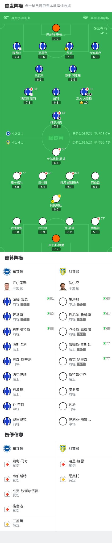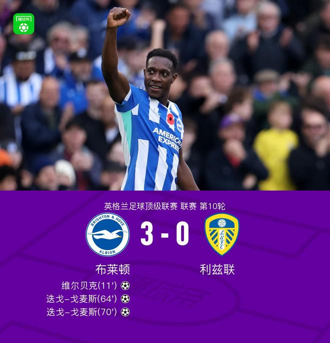 北京时间11月1日,英格兰足球顶级联赛第10轮展开角逐,布莱顿坐镇主场迎战利兹联。比赛中,魏费尔送出精准助攻,维尔贝克冷静破门,为球队首开纪录。随后,迭戈-戈麦斯接队友传球后攻门得手,将比分扩大。比赛后段,扬库巴-明特送出关键助攻,迭戈-戈麦斯再次把握机会完成进球,彻底锁定胜局。最终,布莱顿以3-0战胜利兹联,全取三分。关键事件第11分钟,维尔贝克推射破门,布莱顿1-0领先