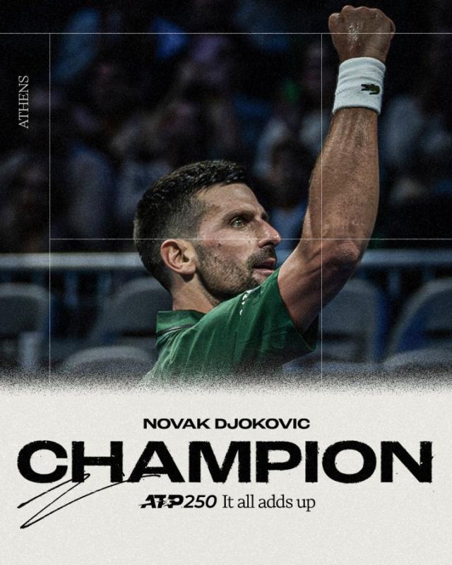 ATP250雅典站决赛,头号种子德约科维奇兑现第二个发球胜赛局,以4比6、6比3、7比5逆转二号种子穆塞蒂,对其取得6连胜,斩获本赛季第2座、职业生涯第101座巡回赛男单冠军。莱巴金娜上月底压哨获年终席位,最终全胜夺年终冠军