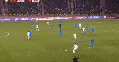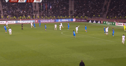 攻势不减的法国队,在第42分钟再次叩开了阿塞拜疆的球门,可惜埃基蒂克手球在先,导致凯夫伦图拉姆的进球,被主裁判无情吹掉,不过半场比赛结束之前,法国队还是扩大了领先优势,右侧角球开出后,造成阿塞拜疆球员自摆乌龙,高卢雄鸡带着3-1的优势,回到了中场更衣室。下半场比赛胜券在握的法国队,明显在场上控制节奏,真正有威胁的进攻机会并不多,第71分钟埃基蒂克的禁区内无人盯防的打门没有踢正部位,浪费了改写比分的绝佳机会,好在并不影响法国队从客场带走胜利。