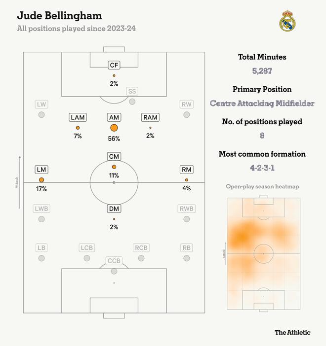 维尼修斯(连续六场比赛无进球)这位25岁的巴西前锋是本赛季皇马的第二号射手,打入5球,但他现在似乎陷入困境,并且因与阿隆索关系紧张而备受争议。他上一次进球是在对阵比利亚雷亚尔的比赛中,当时他在伯纳乌3比1的胜利中梅开二度。自那以后,他连续六场比赛既无进球也无助攻。维尼修斯与新任主帅的紧张关系在俱乐部内外已成为日常话题。他认为阿隆索对自己不公,因为本赛季至今他仅在16场比赛中踢满了5场,并有3场比赛坐在替补席上。他在10月国家德比于伯纳乌举行的下半场被换下时反应愤怒,广播公司DAZN捕捉到他说“我要离开球队了”。这位巴西球员随后发表声明,“为我的反应向所有马德里主义者道歉”,并向他的“队友、俱乐部和主席”致歉——但他没有提到阿隆索。维尼修斯的续约事宜目前搁置,他目前的合同将持续到2027年。他每90分钟的进球和预期进球数略低于上赛季整体水平(分别为0.4和0.41,而上赛季为0.45和0.48)。贝林厄姆(连续两场比赛无进球)还记得贝林厄姆在2023年首次加盟皇马时,尽管身为中场球员,却在处子赛季打出了职业生涯新高的23粒进球吗?自那以后,他在伯纳乌的情况发生了很大变化。在俱乐部层面,贝林厄姆本赛季状态不稳,尽管训练场消息人士(如同本文所有引用的消息来源一样,要求匿名以保护关系)指出,他正在从肩部手术中恢复是原因之一。他在七月俱乐部世界杯后接受了该手术,并于九月底复出。他最初的预计回归日期是十月。尽管如此,贝林厄姆仍需找回状态。阿隆索信任他,在他手术复出后的首场比赛——马德里德比对阵马德里竞技中就让他首发,但在那场2比5的惨败之后,教练连续两场比赛将他放在替补席上——这位英格兰球员对此并不满意。他打入了3个进球,是在十月连续对阵尤文图斯、巴塞罗那和瓦伦西亚的比赛中取得的。但他在对阵利物浦和巴列卡诺时未能破门,就像他在本赛季前六次出场时一样。即便如此,他每90分钟的进球数(0.41)和预期进球数(0.5)都高于上赛季整体水平,尽管样本量非常小。阿隆索在几次新闻发布会上表示,希望他踢中场位置,同时不失去在对方禁区的影响力。贝林厄姆则更倾向于踢更靠前的位置,就像他前任教练卡洛·安切洛蒂使用他的方式一样。下图显示了贝林厄姆自2023年加盟皇马以来主要踢攻击型中场,同时在上赛季也出现在左路。