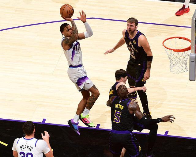 不过,初登场的这个上半场,詹姆斯所面对的局面并不如外界想象的那般轻松愉快。爵士开场外线手感火烫,湖人旧将米哈伊柳克先声夺人,盐湖城后场“少帅”基昂特-乔治火力全开,首节比赛结束时,主场作战的湖人在全员出战的情况下反而落后9分。好在短暂的适应和磨合结束之后,整体实力更出色的湖人在第二节开始找回了手感,启动追分模式,将分差不断缩小。第三节,湖人更是单节净胜爵士15分,在攻防两端都掌控了比赛。东契奇和里夫斯的状态依然无需担心。卢卡魔法虽迟但到,即便外线投篮手感平平,东契奇也依然能依靠出色的进攻技巧和多变的节奏打得爵士措手不及。37分10助攻5篮板4抢断的表现,不过是斯洛文尼亚人的常规操作罢了。
