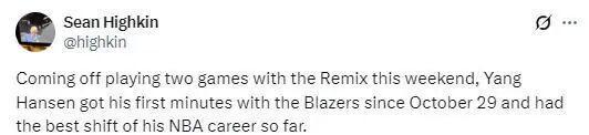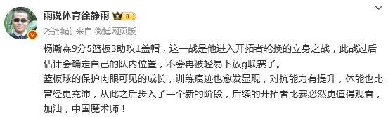 北京时间11月19日,NBA常规赛,开拓者主场110-127不敌太阳。中国球员杨瀚森被召回,时隔20天出现在NBA赛场,他首次获得双位数登场时间,出场13分8秒,7中4贡献9分5篮板3助攻1盖帽,得分、篮板和助攻均为生涯新高,有多次高光得分时刻,让大家看到他更加从容自信的一面。杨瀚森在开拓者的5连客之旅当中被下放到发展联盟,随后他跟随开拓者下属队伍撕裂之城混音打了2场比赛,分别得到8分13篮板4助攻和21分9篮板3盖帽,找到久违的赛场感觉。如今他被召回,他将获得重新返回NBA赛场的出场机会。【高光回顾】杨瀚森出战13分钟拿下9分5板3助1帽展现价值首节比赛,客场作战的太阳先发制人,打出16-7的压制开局,开拓者在换上替补以后实现多点开花持续追分,成功在首节结束时缩小分差到2分。次节比赛,杨瀚森在比赛还剩下8分23秒登场,他惨遭狄龙抢断,久别NBA赛场让他一时之间无法适应高强度对抗。不过他很快调整好状态,他做好每一次卡位和掩护,并且主动单打马克-威廉姆斯完成勾手得分,随后与西索科完成配合实现双手暴扣。显然,有了发展联盟期间的历练保持状态,他会变得更加从容。易边再战,开拓者在没有霍勒迪和格兰特情况下显得进攻实力不足,被太阳频繁打出多点开花的攻势压制,两队分差直奔20+而去,开拓者单节21-36被对手完爆,这或许对杨瀚森来说是个好消息,他有望在比赛提前进入垃圾时间里获得更多出场机会。末节比赛,由于两队分差过大,最多来到25分,因此比赛提前失去悬念。杨瀚森成功重返赛场,他再次和西索科完成配合上篮得手,随后连续为队友送出妙传,杨瀚森的身高优势让他拥有宽阔的传球视野,并且有绝对的进攻实力展示自己,让现场球迷为他欢呼。本场比赛,中国球员杨瀚森替补出场13分钟,7投4中,1罚1中;得到9分5篮板3助攻1盖帽。出场时间,得分,篮板,助攻都刷新了自己的NBA生涯纪录。9分创造了自己的生涯新高,也创造了易建联(单场最高31分)之后,闯进NBA的中国球员在联盟里的单场得分新高(周琦6分、孙悦4分)!在比赛中,开拓者队记者肖恩-海金点评了杨瀚森的表现,并预测他能在明日对阵公牛队的背靠背比赛中继续上场。“前方赛前,也并未得到有关杨瀚森会上场的任何消息,但考虑到球队正在遭遇伤病侵袭,瀚森上场也没那么令人奇怪。我猜明天对公牛他还会出场,因为罗威大概率会缺席背靠背。”赛后,篮球评论员徐静雨发文点评:杨瀚森9分5篮板3助攻1盖帽,这一战是他进入开拓者轮换的立身之战,此战过后估计会确定自己的队内位置,不会再被轻易下放g联赛了。篮板球的保护肉眼可见的成长,训练痕迹也愈发显现,对抗能力有提升,体能也比曾经更充沛,从此之后步入了一个新的阶段,后续的开拓者比赛必然更值得观看,加油,中国魔术师!来源:腾讯NBA(来源:极目新闻微信公众号)