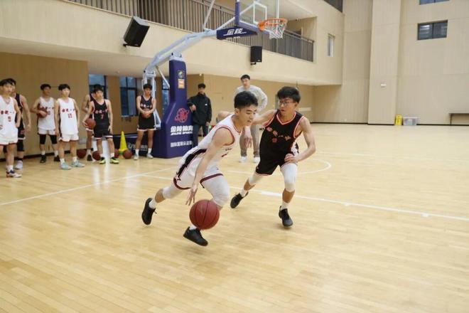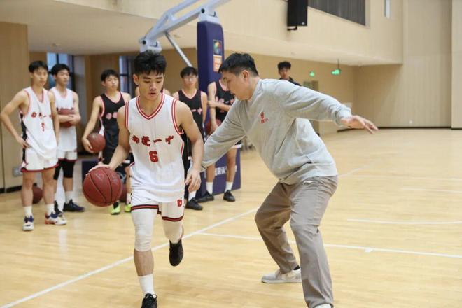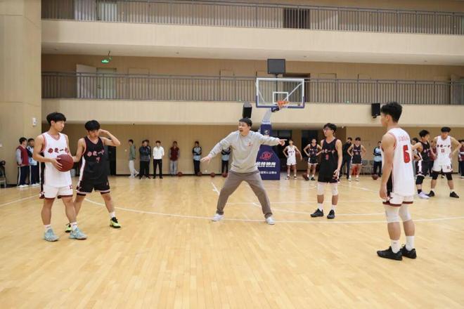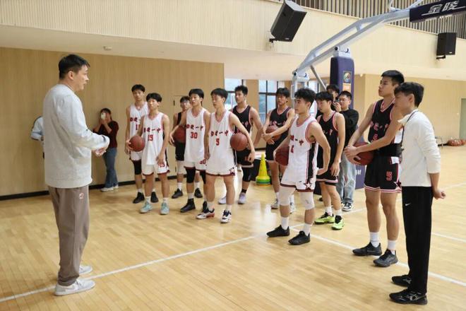 当天,张劲松一行首先参观了学校宣传栏,并听取校史介绍,随后进入昌财体育馆观看校篮球队训练。球场内,身穿两色球衣的校队队员们正进行着绕障碍运球、上篮的训练,密集的击球声在场内回响。张劲松向队员们仔细讲解篮球技术,特别是防守方面的技术要领,并下场安排队员们与其配合,示范单人和多人防守的动作细节。在篮球名宿的指导下,队员们分成多组,展开攻防演练,如同实战。每当看到球员们顺利完成动作,他都会及时给予表扬。“大家要通过协作帮助你的同伴得分,变得更优秀。”他勉励校队队员在平时加强训练,学会利用新方式、新工具进行训练。