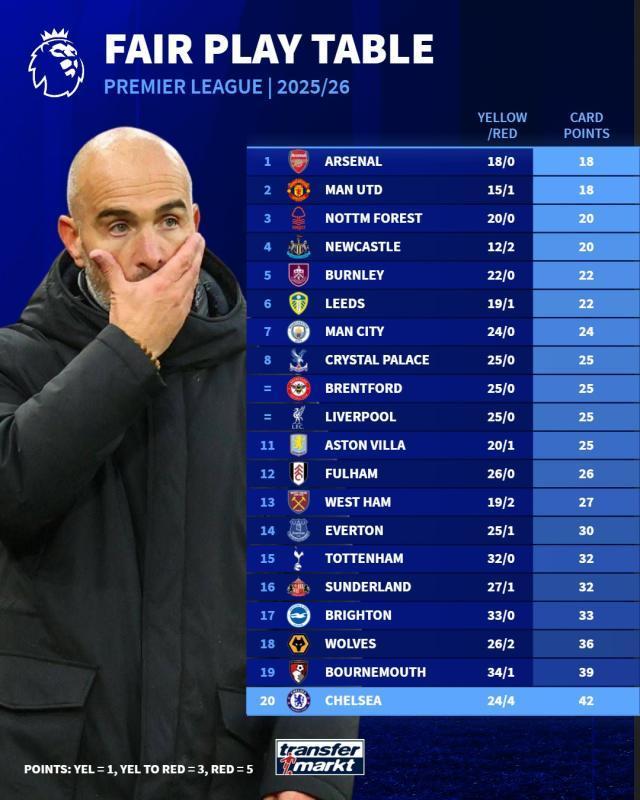 【14】双方本场总计7黄牌1红牌(切尔西1黄1红,阿森纳6黄),其中5黄1红出现在上半场(上半场两队吃牌6张,射门7次)。英超单场红黄牌纪录是去年9月伯恩茅斯vs切尔西一役创下的,共计14张(都是黄牌),是役主裁判也是安东尼·泰勒。【3】2006-07赛季有相关统计以来,阿森纳在英超比赛中,首度开场30分钟内就有3人吃牌。【2】上半场,阿森纳在对方禁区只有2次触球,创2021年12月以来在英超的最低值。【100%】过去3场比赛,廷伯赢下了每一次头球争抢:对热刺3/3、对拜仁3/3、对切尔西5/5。【11/12】里斯·詹姆斯本场数据:12次对抗11次成功、6次传球进入进攻三区、4次被犯规、4次传中、2次创造机会、2次夺回球权、1次助攻、0次犯规。本赛季,詹姆斯各项赛事4次助攻,为队内之最。【20】里斯·詹姆斯在英超已有20次助攻,超越了切尔西边卫前辈阿什利·科尔的19次。【5】本季各项赛事,里斯·詹姆斯已贡献1球4助攻,成为切尔西第7名参与进球达到5+次的球员:若昂·佩德罗7次、恩佐7次、埃斯特旺6次、内托6次、吉滕斯5次、凯塞多5次。【6】生涯迄今,萨卡在英超对阵六强球队参与进球(进球+助攻)数量:对热刺6球、对切尔西6球、对曼联5球、对利物浦4球、对曼城3球。最近7次英超出战切尔西,萨卡有5场参与进球(1球4助攻)。【365】萨卡上次在英超奉上助攻,是在整整1年前,2024年11月30日对阵西汉姆联时。【5】2025年,梅里诺是阿森纳在联赛中的并列头号射手,共打入8球。这当中,5球为头球,在整个英超与布伦特福德前锋沙德并列最多。【70%】梅里诺在英超一共10次破门,其中7球为头球。在英超历史上进球10+的非后卫球员中,只有斯考克罗夫特(本世纪初效力于伊普斯维奇和莱斯特城的英格兰前锋)的头球占比更高(14球包含10个头球,71%)。【1】在21岁152天的年纪,加纳乔成为英超历史上完成100次出场的最年轻南美球员,打破了马丁内利保持的纪录。【162】最近162场英超,阿森纳第2次同时缺少加布里埃尔和萨利巴。切尔西阵容(4231):罗伯特·桑切斯/古斯托、韦斯利·福法纳、特雷沃·查洛巴、库库雷利亚/里斯·詹姆斯、凯塞多/埃斯特旺(46’加纳乔)、恩佐、佩德罗·内托/若昂·佩德罗(55’德拉普)阿森纳阵容(433):拉亚/廷伯、莫斯克拉、因卡皮耶、卡拉菲奥里(46’刘易斯-斯凯利)/埃泽(72’哲凯赖什)、苏维门迪(57’厄德高)、赖斯/萨卡、梅里诺、马丁内利(57’马杜埃凯)相关资讯