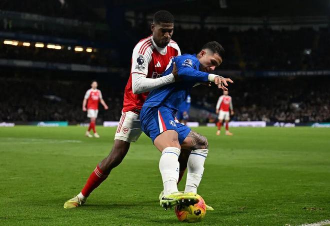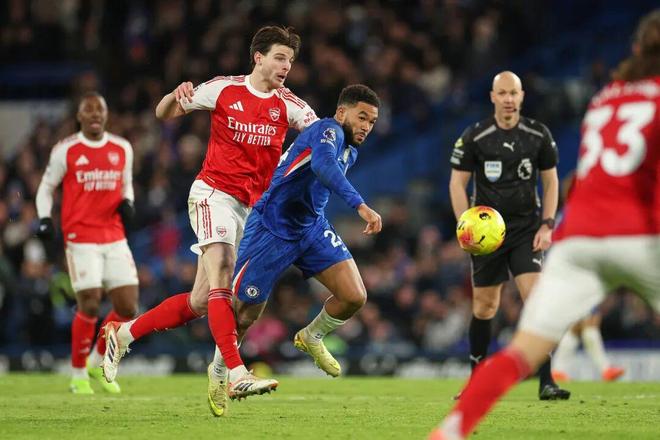 需要注意的是,对垒切尔西开场劣势,主力中卫的缺阵是个很显眼的因素,但严格来说枪手主要是输在了中前场,尤其是中场在蓝军的凶悍围猎之下有点支离破碎。赖斯依然前冲后抢很努力,但没了此前对热刺和拜仁时那种所向披靡的感觉。苏维门迪则身体对抗原本就不是强项,此役对禁区前沿的保护也有所缺失。还有连续两场参与破门的埃泽,先是在凯塞多的看守下施展不开,然后面对詹姆斯和恩佐的备用后腰组合也不占优势。就这一点来看,如果不是凯塞多亮鞋底蹬踏梅里诺,第38分钟就被红牌罚下,阿森纳还真有可能最终被切尔西碾压。当然,蓝军此役把身体对抗强度拉得很高,遭遇减员好像也算不上特别意外。该队一直存在“纪律问题”,上赛季就是英超染黄次数最多的俱乐部(99张),而凯塞多的红牌则是他们本赛季英超的第3张。