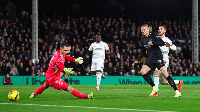接下来的10分钟,曼城继续在场面上压制着富勒姆,控球率超过了80%,进球只是时间问题。第17分钟,曼城在左路连续传递,多库送出传中,赖因德斯巧妙一漏,哈兰德一蹴而就。