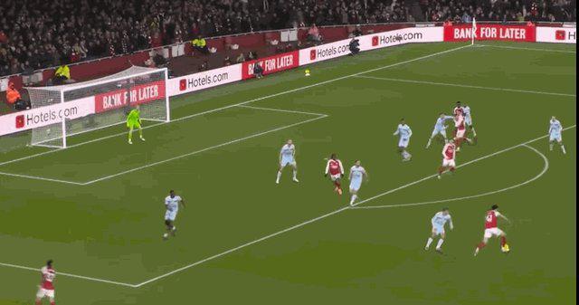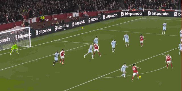 第28分钟,阿森纳前场打出精妙的配合,马丁内利禁区前沿迎球射门高出横梁。