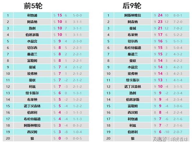 不妨先看看这个积分榜,一个是英超前5轮的,一个是英超后9轮的(曼联和西汉姆未赛),大家能不能发现一些有趣的事情呢?是的,前5轮,高居第一名的是5场全胜的利物浦,5场不胜的阿斯顿维拉跌至降级区的第18名,后9轮,高居第一名的是阿斯顿维拉,利物浦以一个净胜球的优势,勉强排在第17名,两支球队似乎交换了位置。利物浦的颓势,以后再说,阿斯顿维拉在最近9场比赛取得8场胜利,比阿森纳还要多1分,表现更出色,成为英超第一,是近况最佳的球队,排名从倒数第三,连升15名,一下子来到正数第三。更有趣的是,维拉唯一失利的比赛,刚好就是负于利物浦,不得不说,有些时候,世事就是那么奇妙。