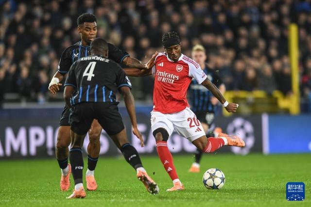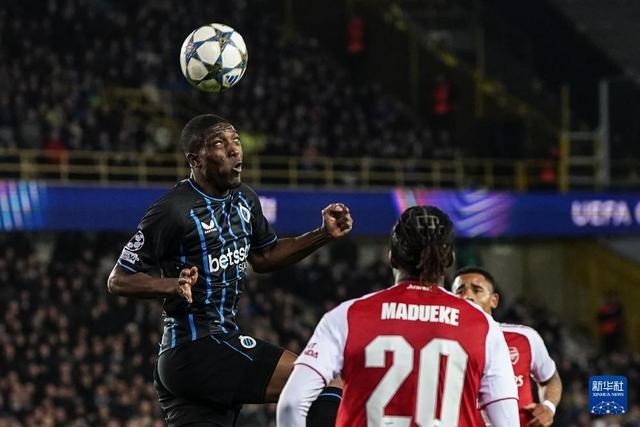 12月10日,布鲁日队球员奥多涅斯(左)在比赛中头球。新华社记者 彭子洋 摄