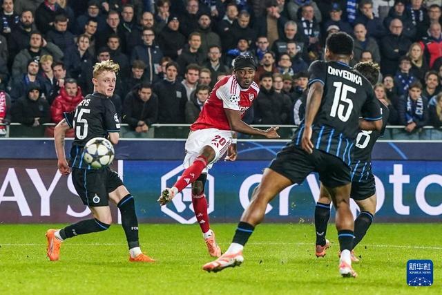 12月10日,阿森纳队球员马杜埃凯(左二)在比赛中射门。新华社记者 彭子洋 摄