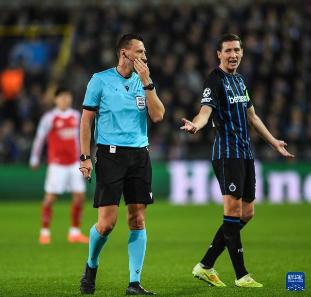 12月10日,布鲁日队球员瓦纳肯(右)在比赛中不满裁判的判罚。新华社记者 彭子洋 摄