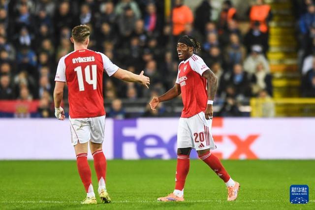 12月10日,阿森纳队球员马杜埃凯(右)在比赛中得分后与队友庆祝。新华社记者 彭子洋 摄
