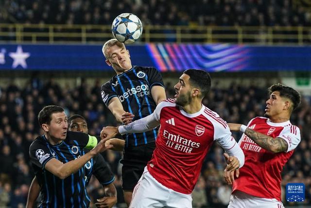 12月10日,布鲁日队球员西奎特(左二)在比赛中争顶头球。新华社记者 彭子洋 摄