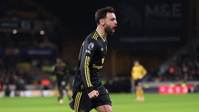 依靠着高位逼抢战术,曼联也是成功取得了进球:需要注意的是,在狼队的进攻退过半场后,曼联的阵型实际上还是回收的状态,但在球队右路形成点对点压迫的情况下,B费的位置开始大幅度前提,和库尼亚已经锁死了狼队球员的回传路径,在狼队中场无人接应的情况下,曼联此时在前场已经形成了4防4,这也是曼联在逼抢后能快速惩罚对手身后空间的关键——当然了,如果在射门时,B费的动作不用连滚带爬的,那就更好了……