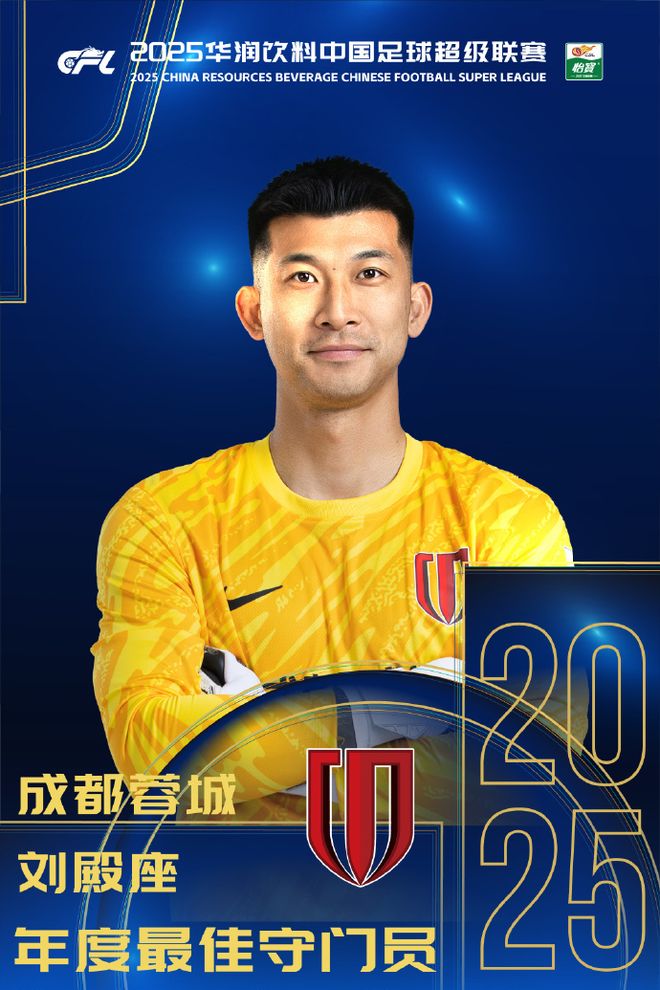 年度最佳守门员:刘殿座(成都蓉城)本赛季,35岁的国门刘殿座为蓉城出战27场完成10次零封仅丢25球,扑救48次扑救,成功率63.16%。