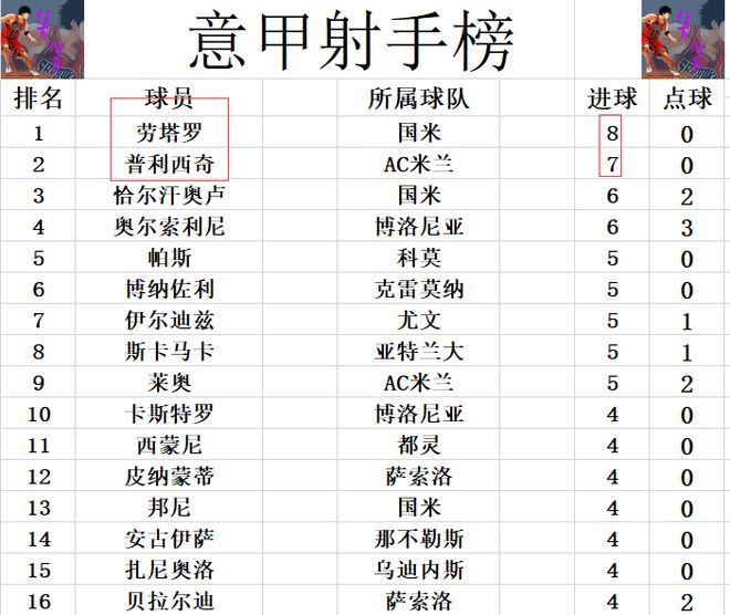 射手榜方面,劳塔罗今天传射建功,超过普利西奇,8球独居榜首,普利西奇7球紧随其后。恰尔汗奥卢和奥尔索利尼6球并列第3。邦尼,西蒙尼,卡斯特罗等人4球刚好挤入前十。相关资讯