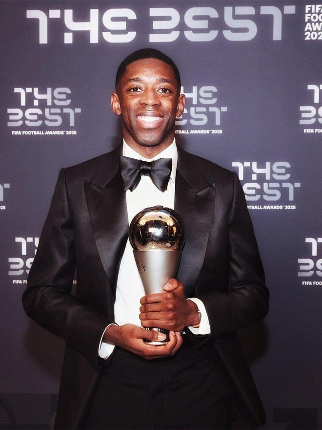 FIFA年度最佳男足球员:登贝莱(法国)在24/25赛季,登贝莱共代表巴黎圣日耳曼出场53次,打进35粒进球,送出16次助攻。随巴黎圣日耳曼获得4项冠军:法国杯、法超杯、法甲和欧冠。个人荣誉层面,登贝莱上赛季获得了法甲金靴、法甲最佳球员、欧冠最佳球员。此外,登贝莱还在9月底获颁2025年金球奖这一重量级的个人奖项。