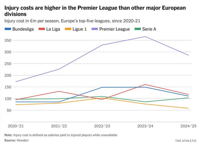 据Howden保险经纪公司最新发布的数据显示,过去五个赛季,球员伤病给英超俱乐部造成了10亿英镑的损失。该公司长达286页的年度报告(数据来源于第三方公司的分析)发现,英超联赛的总体伤病频率在四个赛季内下降了25%,从2021-22赛季的峰值(1289例)降至2024-25赛季的957例。在此期间,Howden所称的伤病“成本”(定义为球员的日基本工资乘以其因伤缺阵的天数)有所波动。该总成本在四个赛季内(他们首次发布的报告始于2020-21赛季)上升,于2023-24赛季达到3.6569亿英镑的峰值,随后在上赛季下降了21.8%,至2.8574亿英镑。总计过去五个赛季,欧洲五大联赛的伤病“成本”总额接近30亿英镑(他们假设俱乐部向受伤球员全额支付工资),其中40%来自英超球员。
