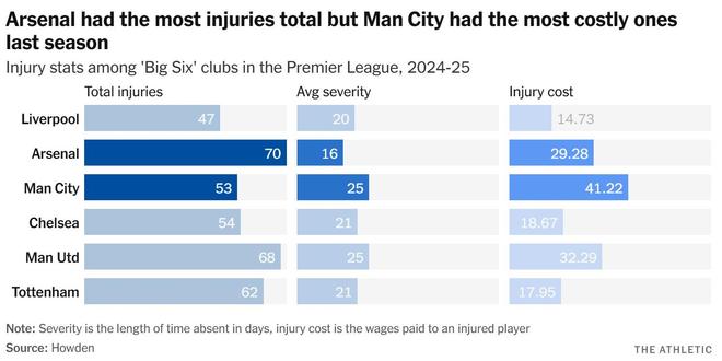 Howden公司体育部门负责人詹姆斯-伯罗斯表示,这项研究“凸显了精英球员日益增长的身体负荷——我们已经看到伤病数量及相关成本的演变,这与当前围绕加强比赛中球员保护的辩论相呼应”。Howden的研究人员承认伤病具有“无差别性”,并认为导致这些趋势的原因是多方面的。部分情况是,在2023-24赛季,高薪球员受伤的情况比上赛季更多。其他关键发现包括,令人担忧的是,自2020-21赛季以来,欧洲主要联赛的伤病严重程度上升了30%。这是衡量球员伤停时间长短的指标,因此,虽然伤病频率下降了,但当球员真的受伤时,情况却更为严重——五年前,球员平均缺席14天,而上个赛季则上升到22天。此前曾为曼联和红牛集团工作的伤病风险专家罗宾-索普博士指出,“严重程度的上升与恢复窗口期缩短、累积疲劳以及部分球队精英赛事日益密集和紧凑的赛程安排有关”。业内认为,大多数主教练偏爱基于控球的打法以及侵略性的人盯人逼抢,这也是一个促成因素。伤病数据中还存在一些显著趋势。过去五个赛季中,无论Big 6中哪支球队遭受的伤病最多,该队都从未赢得联赛冠军。上赛季,利物浦是球员可用性最好的球队,而阿森纳的伤病数量增加了三分之一,最终以10分之差落后于冠军。21岁以下球员已被证明特别容易受伤。年轻球员出场时间增加是近几个赛季的上升趋势,而他们的伤病严重程度是所有年龄组中最高的,这表明从青训学院级别跨越到一线队对身体带来的挑战。索普博士认为,这“可能指向球员发展路径中的系统性缺陷”,而青训足球领域的工作人员也深刻意识到弥合这一差距的挑战,并强调租借期的重要性,技术天赋出众的球员可以在租借期间锻炼身体对抗的韧性。事实上,Howden发现最容易受伤的是英超21岁以下的前锋,英超21岁以下的中场球员在该列表中位列第四。不论年龄组,前锋都是最容易受伤的位置。研究人员还注意到守门员的伤病频率和严重程度有所上升——这指出了该位置的演变要求守门员具备更强的脚下技术和清道夫式出击能力。值得注意的是,迄今为止的数据显示,世俱杯对伤病率的“影响微乎其微”。参赛的九家欧洲俱乐部中,有五家在2025年6月至10月期间的球员可用性实际上比2024年同期更好,尽管切尔西和巴黎圣日耳曼一直饱受伤病困扰。同样,曼城在参赛期间安然无恙,但随后却遭遇了大量伤病。研究人员打算等待赛季临近结束时再得出进一步结论,他们指出伤病的“高峰期”通常出现在11月至2月之间。这是由于整个冬季英超比赛数量增加,且缺乏像欧洲其他地区常见的那种冬歇期。目前认为世俱杯影响有限的另一个注意事项是,他们发现2022-23赛季欧洲的伤病“成本”上升了26%,而那个赛季恰逢12月举行了冬季世界杯。伤病的类型也在发生轻微变化。过去四个赛季中,腿筋受伤的球员数量起伏不定,而上赛季肌肉损伤有所增加。与此同时,膝伤则大幅下降。“英超联赛持续表现出肌肉和腿筋损伤的最高负担,这与其高节奏、大量转换的比赛风格相符,”索普博士说。比赛数据显示,近几个赛季反击次数呈上升趋势,以至于英超已经从德甲手中夺走了“反击联赛”的头衔。在Howden五年伤病成本记录中,最糟糕的月份是2023年8月,这让研究人员略感意外(考虑到冬季赛程安排),他们认为这凸显了充分的季前训练和赛季间足够休息窗口期的重要性。“这不仅仅是一个医疗问题,”索普博士补充道,“它反映了竞赛结构、发展路径、战术演变和组织决策之间复杂的相互作用。”【上咪咕独家看英超】相关资讯