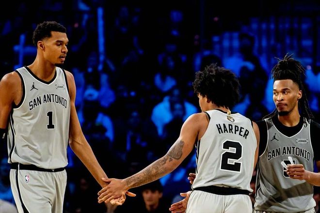 所以,上半场马刺队取得了领先。尼克斯那边,是靠着OG·阿奴诺比的高效发挥,半场20分才在半场结束前将分差追至2分,不至于被对手半场拉开两位数的分差。易边再战,文班亚马的手感虽然不佳,但靠着极高的下限维持着比赛状态。加上哈珀、卡斯尔等人势头正盛,而随着文班亚马扔进三分,在三节末的时候,马刺队将分差扩大至两位数。就在所有人以为这又是一场马刺队打脸ESPN预测的比赛时,尼克斯一波10-0直接追了上来。这其中,克拉克森的发挥功不可没。毕竟,这家伙名字前面带着一个乔丹。还没完,外线有克拉克森,内线还有一个能在文班亚马头上拿下10个进攻篮板的米罗!