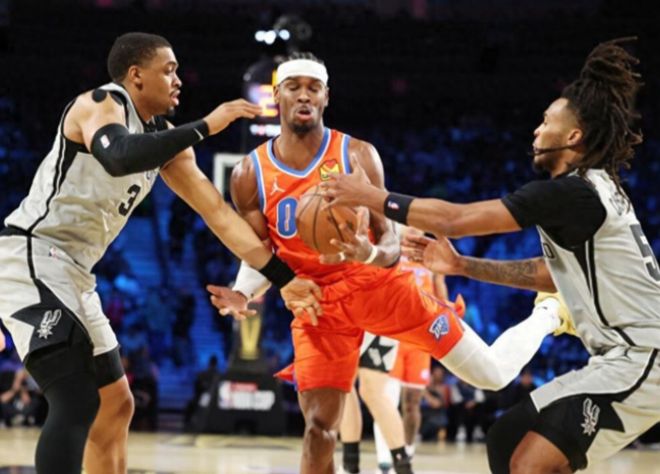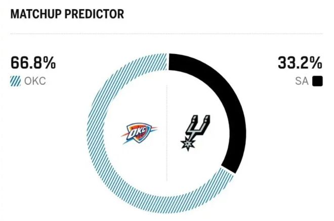 赛前,美媒ESPN对本场比赛进行了胜率预测,马刺队胜率仅有33.2%,依旧不被看好,雷霆队胜率则高达66.8% 。首发阵容方面,马刺队这边,文班亚马因左小腿伤病管理出战成疑,教练排出的最新首发五人组为:哈里森-巴恩斯、斯蒂芬-卡斯尔、达龙-福克斯、德文-瓦塞尔、卢克-科内特;雷霆队这边,杰林缺阵,切特和哈滕迎来复出,首发阵容则为:亚历山大、杰伦-威廉姆斯、多尔特、哈滕、切特-霍姆格伦。