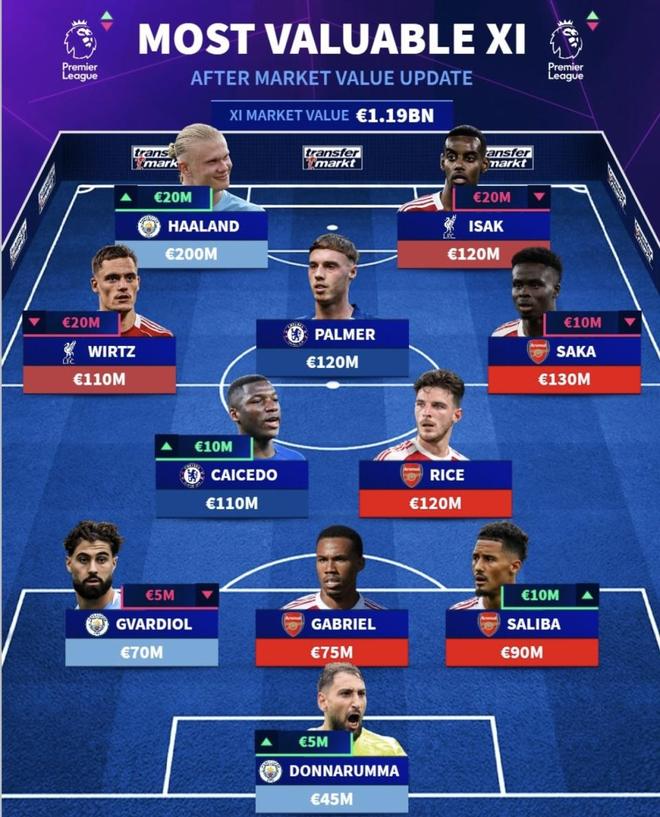 中场维尔茨 | Florian Wirtz身价:1.1亿欧元效力俱乐部:利物浦(图中徽章)国籍:德国年龄:22岁身价变化:-2000万欧元帕尔默 | Cole Palmer身价:1.2亿欧元效力俱乐部:切尔西国籍:英格兰年龄:23岁身价变化:0凯塞多 | Moisés Caicedo身价:1.1亿欧元效力俱乐部:切尔西国籍:厄瓜多尔年龄:24岁身价变化:+1000万欧元赖斯 | Declan Rice身价:1.2亿欧元效力俱乐部:阿森纳国籍:英格兰年龄:26岁身价变化:0