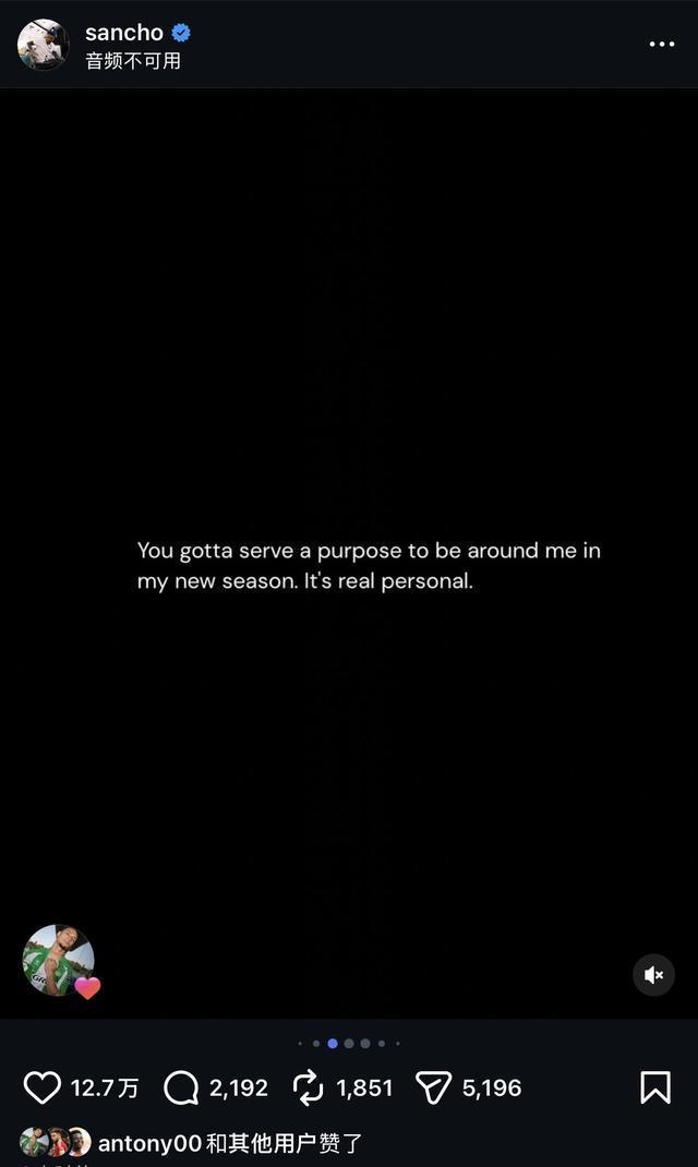 这名25岁的球员罕见更新个人社媒账号,发布了一组包含11张照片的动态,并配以多条文字。其中一条写道:“在我的新阶段,你必须对我有用才能待在我身边。这对我来说意义重大。”此外,他还写下“执行任务中”,以及“距离、沉默、平静”等字句。桑乔目前以赛季租借形式效力维拉,但在英超赛场上始终未能获得稳定机会。他至今尚未在主帅埃梅里执教的球队中完成英超首发,本赛季在联赛中的8次替补出场合计仅127分钟。相比之下,桑乔在欧联杯中的出场时间相对更多,本赛季已在该项赛事中首发4场。不过,他至今仍未为维拉贡献进球或助攻。当前,维拉在英超积分榜上排名第三,仅落后领头羊阿森纳3分,竞争形势激烈,桑乔要跻身主力阵容仍面临不小挑战。【上咪咕独家看英超】相关资讯