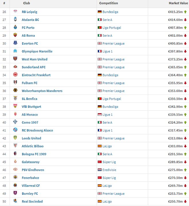同时,在排名前20位的球队里,英超占了11席,这让英超以127.8亿欧元,成为世界上最有价值的联赛。跻身前10的球队,还有排名第4位的巴黎圣日耳曼,排名第6位的巴萨以及排名第8位的拜仁。除了五大联赛球队之外,葡萄牙体育以4.63亿排名最高,但仅排名第23位。
