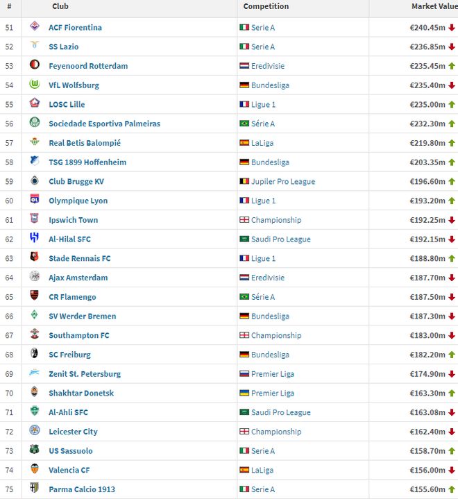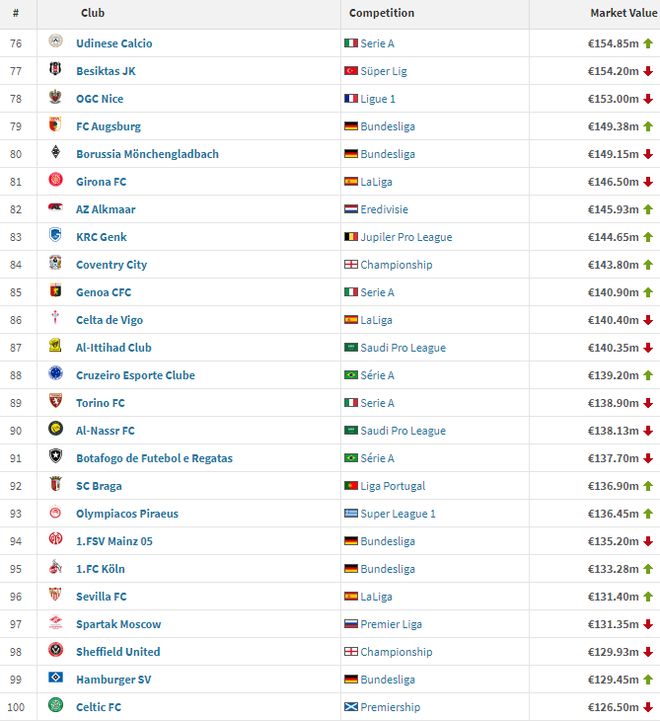 在亚洲球队里,利雅得新月排名最高,以1.92亿排名第62位,其次是吉达国民(第71位,1.63亿)、吉达联合(第87位、1.40亿)以及利雅得胜利(第90位、1.39亿)。相关资讯