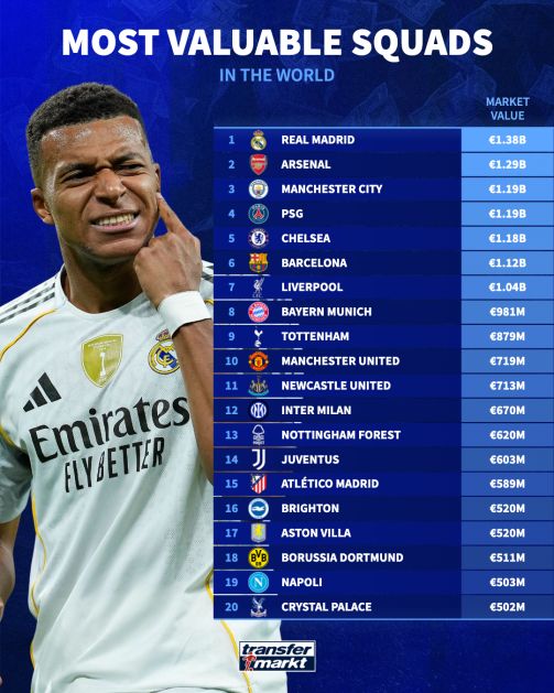 在这一排行榜上,皇马以13.88亿欧元排名榜首,也成为唯一一支身价超过13亿的球队。其中,皇马拥有姆巴佩、贝林厄姆、维尼修斯、巴尔韦德4名身价过亿的球员。阿森纳、曼城两支英超球队则分别以12.98亿、11.98亿排名第2、3位。值得强调的是,在排名前10位的球队里,英超球队占了6席,除了阿森纳、曼城之外,切尔西、利物浦、热刺、曼联分别排名第5、第7、第9和第10位。