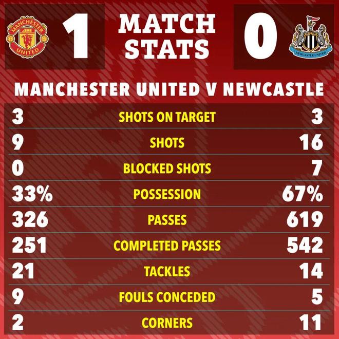 达洛浪费了另一个提前确保胜局的良机,他接到利马的长传,但一脚挑射高出横梁之外。幸运的是,这不妨碍曼联最终赢球,因为如前所述,纽卡斯尔的射门比红魔更烂。比赛结束前,他们两次打出「高射炮」为红魔解围。最终曼联1-0小胜,第23次赢得节礼日大战为英超最多,而纽卡斯尔则17次输球是节礼日的头号送礼童子。