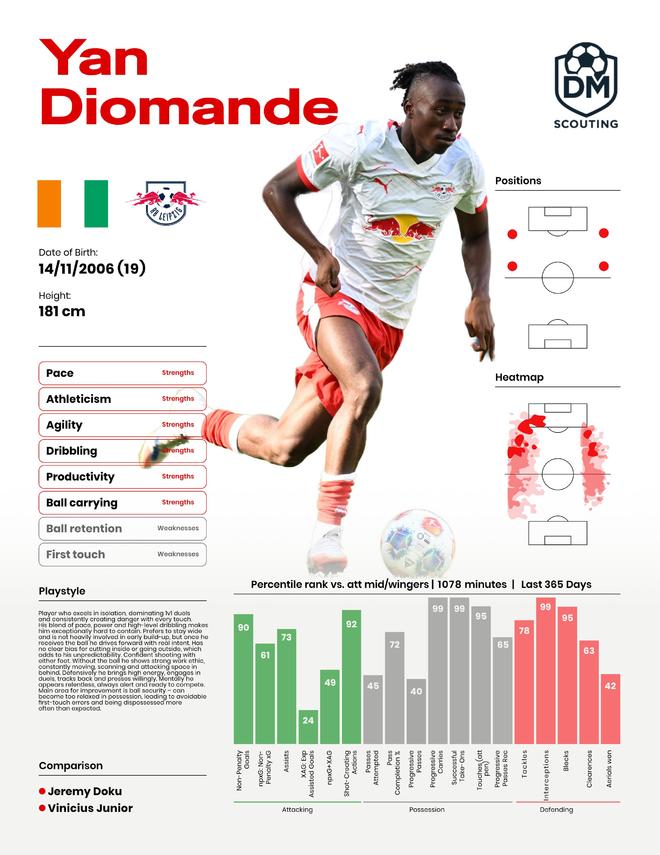 西纳约科是一名全能型前锋,不仅能打中锋,还可以胜任左右两翼。但他的进球效率不高,159次为欧塞尔出场,只打入25球,另有23次助攻。本赛季,西纳约科代表欧塞尔参加了16场法甲联赛,共打入6球并送出2次助攻。根据德国「转会市场网」的数据,他目前的转会身价约为700万欧元。目前没有更可靠的消息来源报道过曼联与西纳约科之间的任何关联,因此对于这一传闻,可以当做《故事会》观看,很可能是经纪人的「抬价」手段。曼联最近确实与另一名前锋有传闻,这得到了罗马诺的确认,莱比锡红牛的亚恩·迪奥曼德(Yan Diomande)是红魔和热刺派出球探考察的目标。「我听说有几家英超俱乐部都在关注这孩子。」罗马诺说道,「他目前在莱比锡红牛表现非常出色,同时他还代表科特迪瓦参加了非洲国家杯比赛。这是一名极具天赋的边锋,既擅长盘带,速度也很快。所以他是一名非常出色的球员,拥有巨大的潜力,真是非常有趣的天才。所以我要告诉你们,不只是曼联和热刺关注他,但两队持续考察他的情况。」德国天空体育的弗洛里安·普莱滕贝格称,莱比锡红牛为迪奥曼德要价超过8700万英镑。但必须强调的是,19岁的左边锋迪奥曼德,只是一名被认为具有潜力的未来型球员,而不是马上就能决定比赛胜负的成熟球员。本赛季他在14场德甲打入6球,并有3次助攻。「竞技网」的权威转会专家大卫·奥恩斯坦表示,在被塞门约拒绝后,曼联不大可能在冬窗寻求引进其他前锋,但未来的转会窗可能再次考虑该位置。