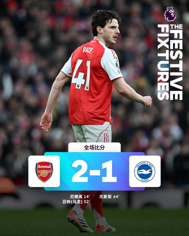 阿森纳主场2-1战胜布莱顿英超第18轮,阿森纳主场对阵布莱顿。这场比赛阿森纳是有压力的,因为他们一旦不胜,就会失去榜首位置,结果厄德高打进了赛季首粒进球,萨卡贡献了助攻,赖斯制造对手乌龙,阿森纳一度2-0领先。虽然在第64分钟,布莱顿球员迭戈·戈麦斯补射破门,为布莱顿扳回1球。最终,阿森纳主场2-1战胜布莱顿。
