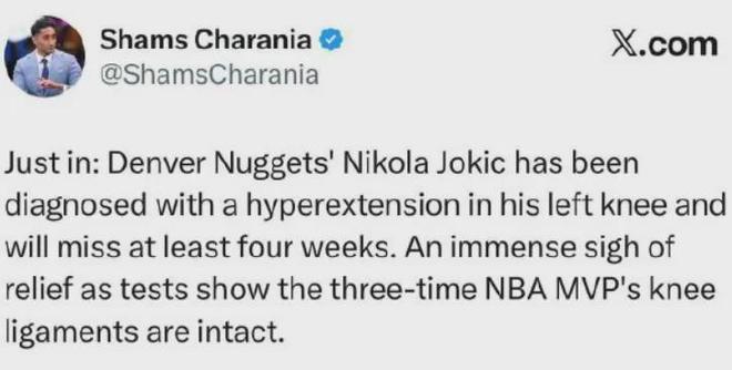 爆料王Shams:约基奇膝盖过度伸展,韧带完好无损,但也需要至少休战四周时间。