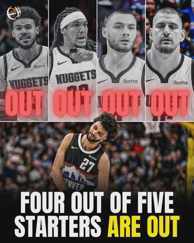 值得一提的是,在约基奇受伤之前,戈登(右腿筋拉伤)、布劳恩(左脚踝扭伤)和约翰逊(右膝挫伤)已经受伤了,意味着掘金首发五虎如今只剩穆雷一人还能披挂上阵......