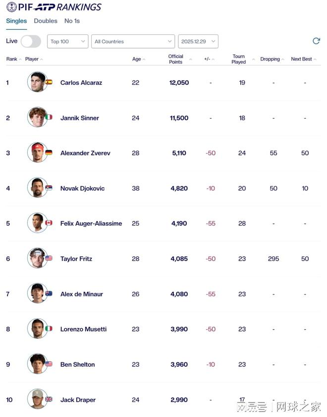 从当前的顶尖球员被扣分情况来看,除了阿尔卡拉斯、辛纳和德雷珀未被扣分之外,前十球员中的七人均因新规受到了不同程度的影响。让人欣慰的是,扣分并未引发前十排名地震,所有前十球员的位次并未因此发生改变。