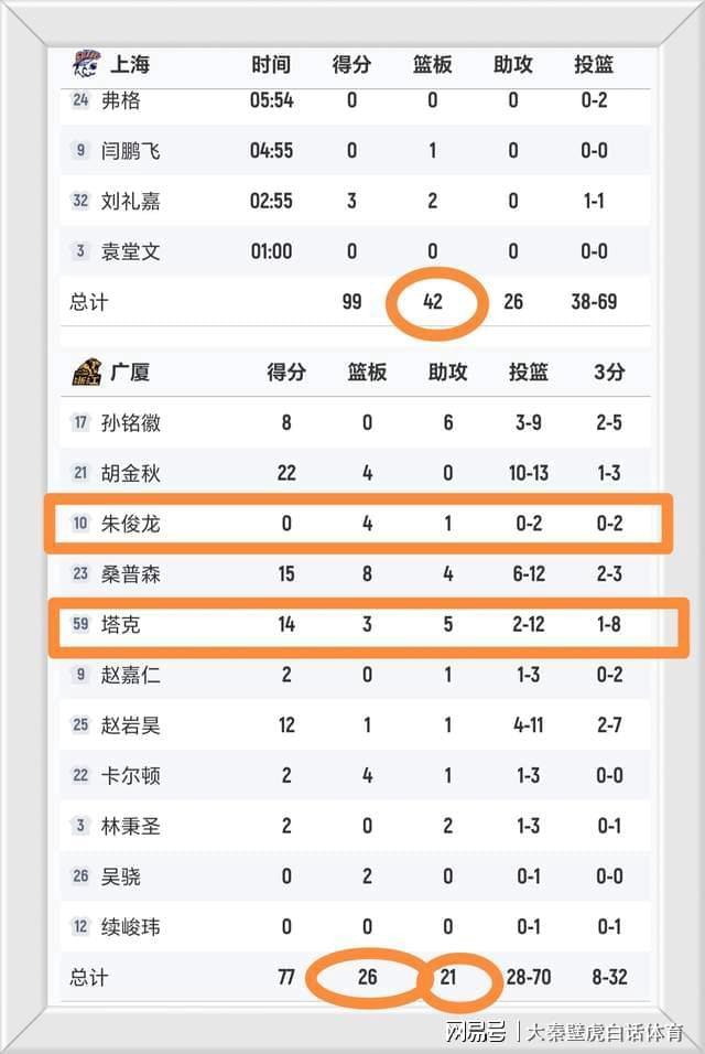 上海队全场拿到42个篮板球,广厦队只有26个,狂输16个。