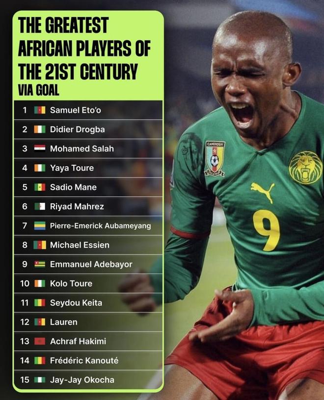 最近GOAL发布了“21世纪最伟大的非洲球员”榜单,埃托奥排第1,德罗巴排第2,萨拉赫只拿到第3。更扎眼的是,马赫雷斯排到第6、阿什拉夫排到第13,而奥科查、阿德巴约这些老一辈名字也挤进了前15,同一张榜单里新老混在一起,排序一出来就很难让所有人都服气。数据截至撰文时2025年12月31日。