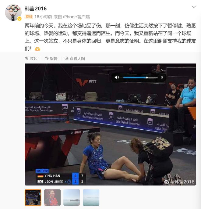“两年前的今天,我在这个场地受了伤。那一刻,仿佛生活突然按下了暂停键,熟悉的球场、热爱的运动,都变得遥远而陌生。”当多哈冠军赛落幕时,韩莹这样写道,“而今天,我又重新站在了同一个球场上。这一次站立,不只是身体的回归,更是意志的证明。”