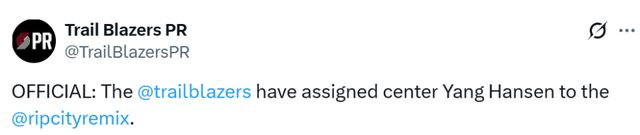 北京时间1月15日, 开拓者官方宣布下放杨瀚森到G联赛,他今日将代表撕裂之城混音出战俄克拉荷马城蓝队。目前,混音在G联赛西部排名第10,战绩是4胜5负。蓝队在西部排名第14,战绩是2胜7负。