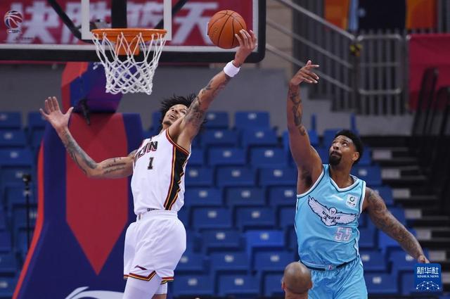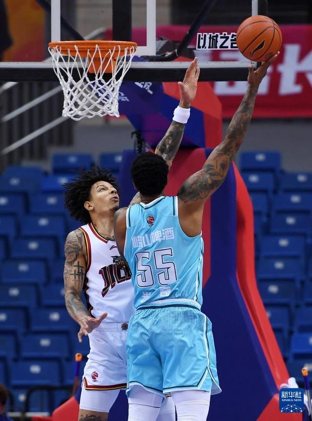 1月15日,吉林长白山恩都里队球员威尔逊(左)在比赛中防守青岛崂山啤酒队球员米奇。新华社记者 李紫恒 摄