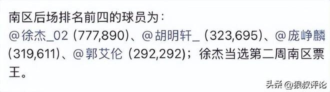 最为具有看点的是,南区首发后卫的竞争,达到非常惨烈的地步,徐杰以70万票坐稳票王位置外,另外一个首发位置获票非常接近。