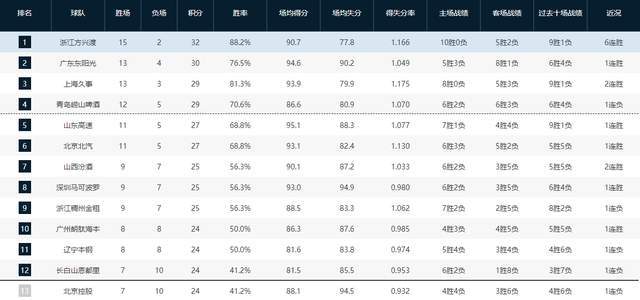 CBA常规赛已经打到第17轮,在本轮已经结束的四场对决中,只有北控与广州这场比赛出现大爆冷,广州男篮主场104-75大胜北控男篮,剩余三场都是以强胜弱,山东男篮77-68力克吉林男篮,广东男篮客场104-76大胜四川男篮,浙江广厦90-75轻取青岛男篮。在这四场比赛结束之后,CBA积分榜排名也是发生新的变化,浙江广厦依旧稳居第一,广东男篮暂时反超上海杀回第二的位置,北控男篮遭遇29分大败暂列第十三名,山东男篮已经反超北京首钢升至第五。