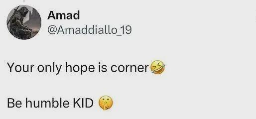 曼联边锋阿玛德·迪亚洛在周日帮助曼联3-2客场逆转英超“领头羊”阿森纳后,第一时间在社媒开嘲:“你们唯一的指望就是角球罢了”,并配上一个笑哭的表情。27岁的科特迪瓦人本场首发出任右边锋,踢了88分钟,是迈克尔·卡里克两连胜计划里的关键棋子。