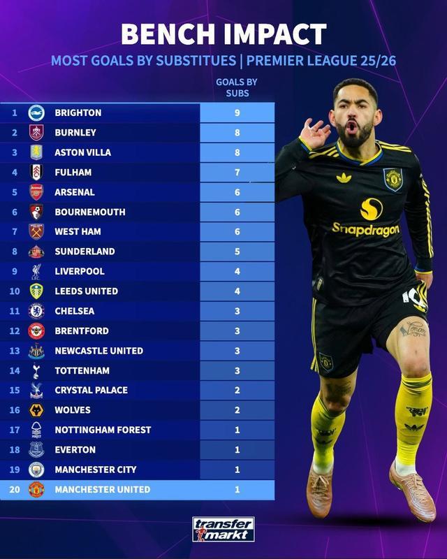 在马特乌斯-库尼亚对阵阿森纳打入制胜球之前,曼联是本赛季英超唯一一支替补球员没有进球的球队。
